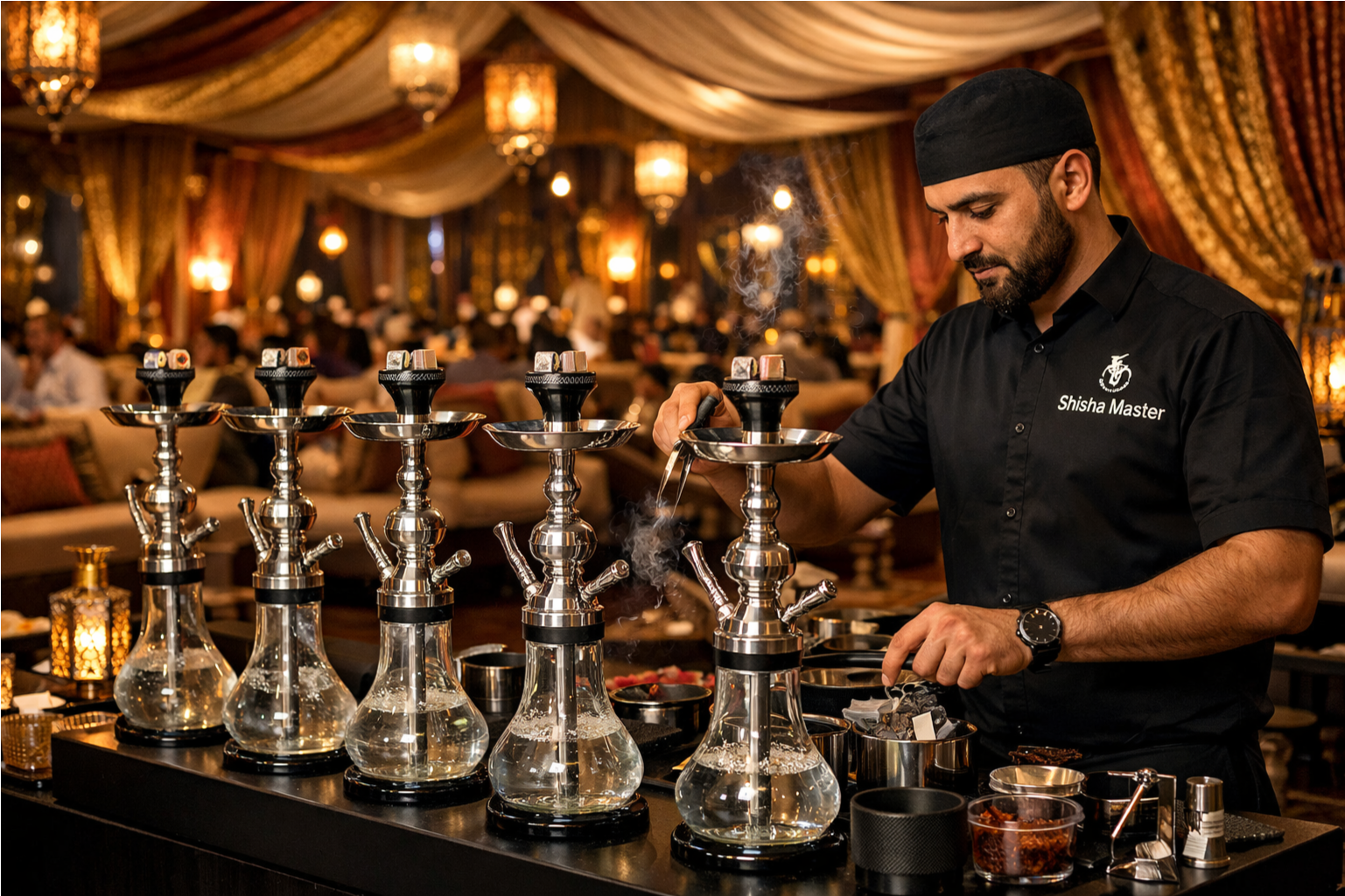 Ramadan tents often host hundreds of guests simultaneously. This requires a large, highly trained team to manage the setup, maintenance, and continuous service of dozens of shishas. Our team of Shisha Masters is specifically trained for high-volume, premium events, ensuring no guest is left waiting.